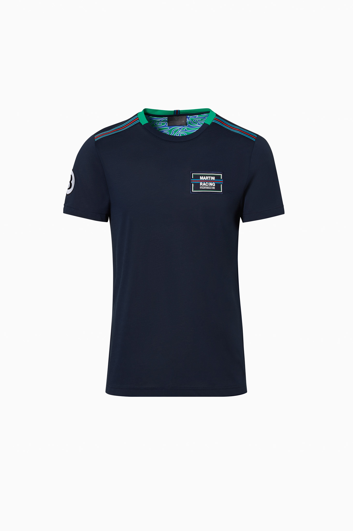 Camiseta de manga curta com gola redonda em azul escuro e verde. Faixa decorativa nos ombros e na gola nas cores típicas da MARTINI RACING®.