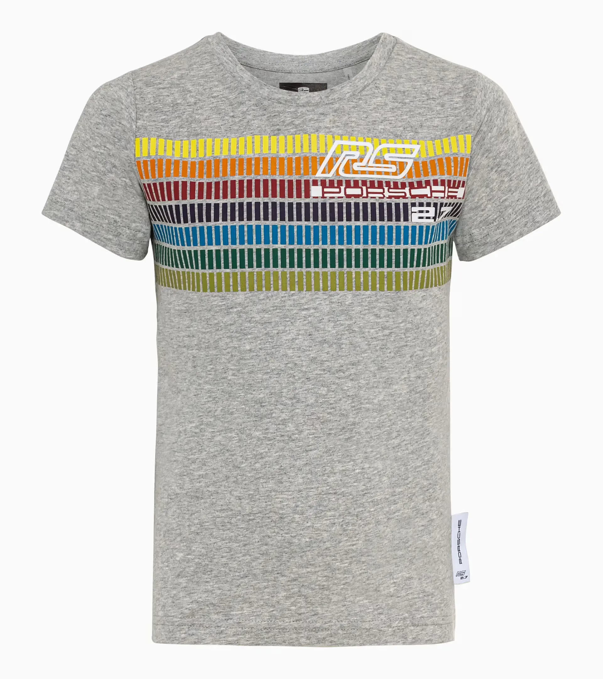 Encha de cor a vida dos fãs mais jovens da Porsche: a camiseta da coleção RS 2.7 homenageia a vibrante variedade de cores do 911 Carrera RS 2.7, lançado no Salão do Automóvel de Paris em 1972. A frente da camiseta casual é decorada com listras e uma estampa do logotipo RS 2.7 da Porsche.