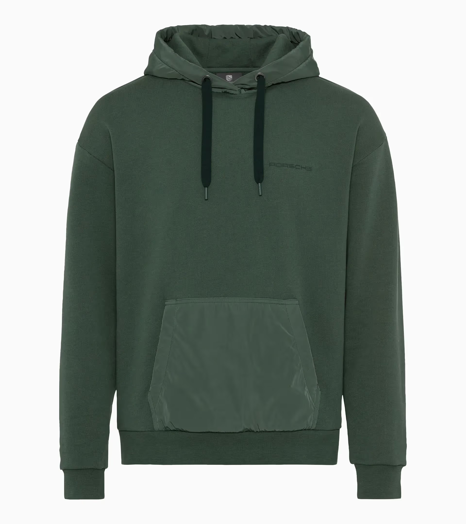 O moletom unissex de algodão possui bolso canguru e capuz, que ganha um toque especial com o material de nylon. Ele impressiona visualmente com a inscrição "Porsche" no lado esquerdo do peito, enquanto o grande brasão da Porsche aplicado nas costas o torna uma peça verdadeiramente marcante.