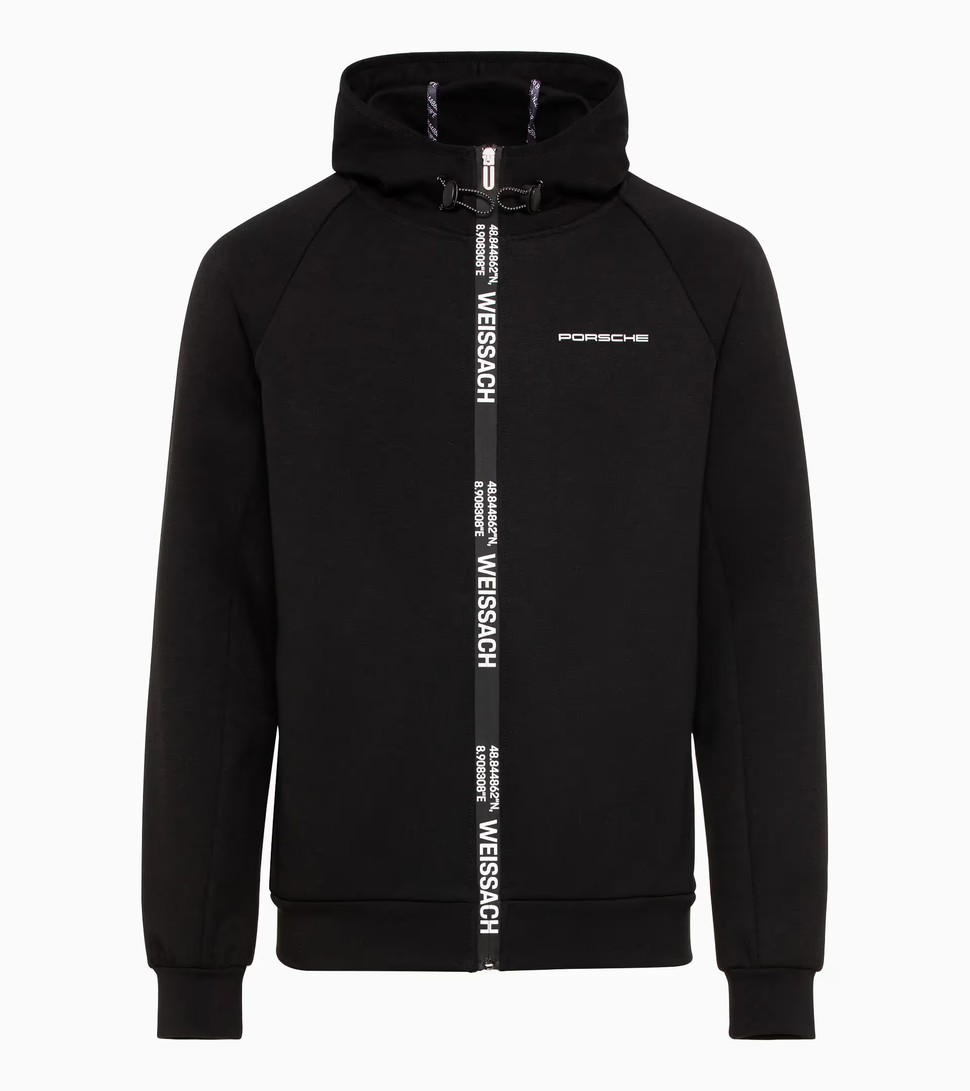 A jaqueta esportiva Porsche da coleção Essential tem um visual e toque de alta qualidade. Ela apresenta o logotipo de Weissach e as coordenadas da cidade no zíper. Na parte frontal, há uma estampa 3D em silicone do logotipo da Porsche no peito. Outra estampa na parte inferior das costas exibe uma imagem da pista de testes de Weissach. Bolsos laterais com zíper oferecem espaço para chaves e smartphone.