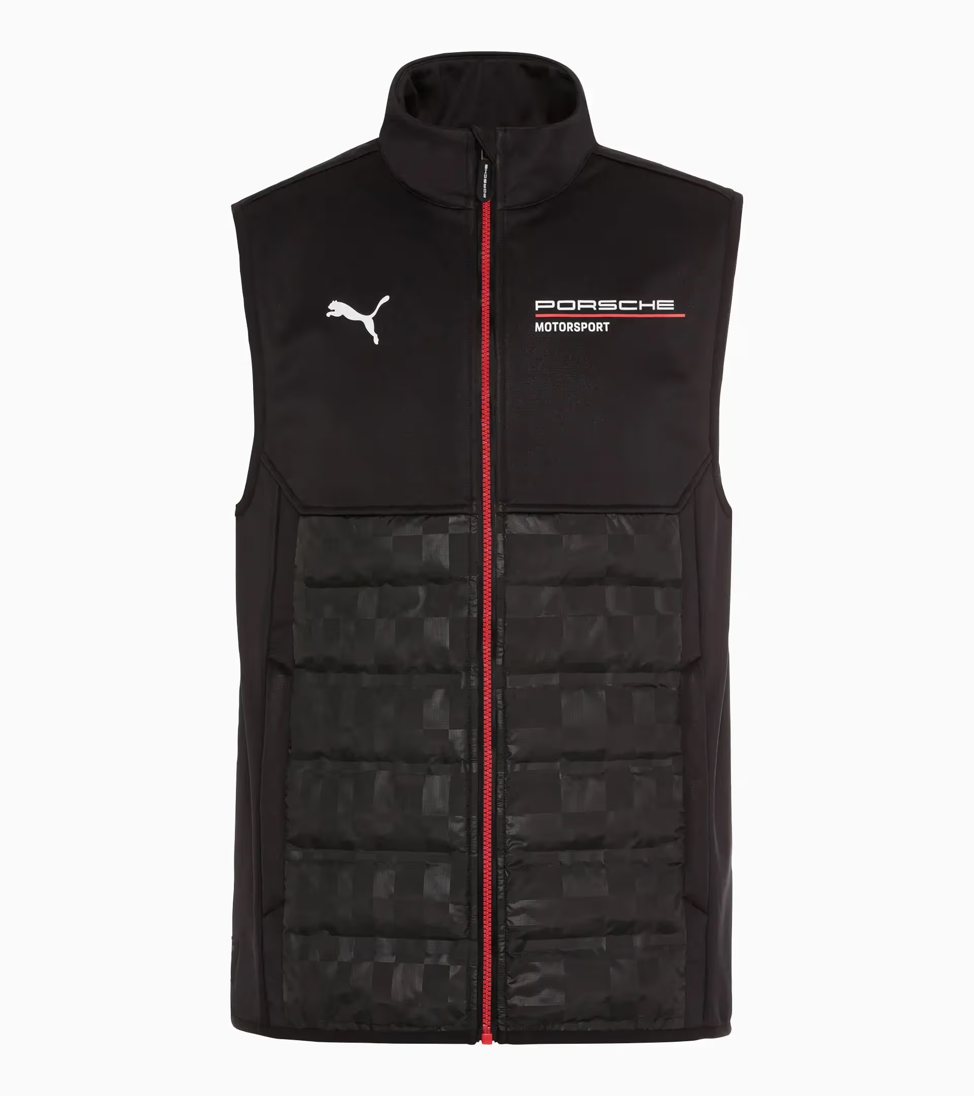 Detalhes em vermelho vibrante e o icônico padrão Pascha dos anos 70 combinam a rica história da Porsche com a dinâmica das corridas. O colete unissex, com modelagem moderna e regular, une conforto e proteção ideais, graças à combinação de softshell e nylon acolchoado, estampado com o padrão Pascha em tom sobre tom.